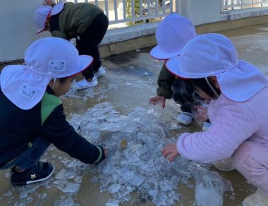 寒波がやってきた日、屋上に行ってみると、、、氷が沢山張っていました。割ったり集めたり触ってみたり、、冬の自然現象を楽しむ2歳のお友だちです。