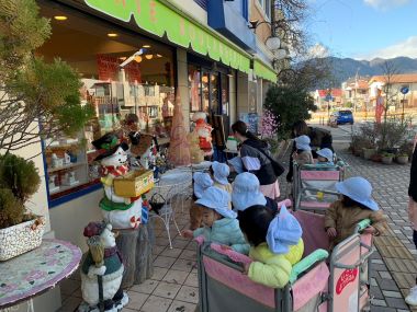 1歳児のたんぽぽさんは園の周辺をお散歩に行きました。冷たい風や街の装飾から年末の雰囲気を感じられたようです。