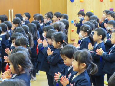 年少以上のこどもたちは遊戯室に集まり、2学期の終業式を行いました。
