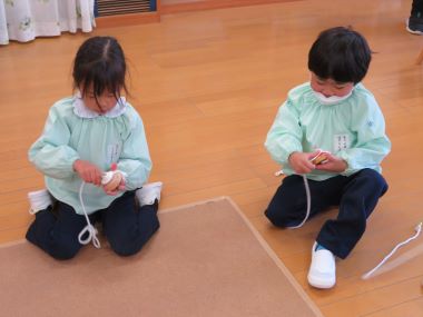 年長さんもお年玉で頂いたコマに挑戦。紐を巻くのも難しいのですが、根気よく巻こうとする姿が見られました。