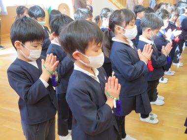 式の始めにお念珠を手に掛けてお参りをします。落ち着いたお参りをする年長さん。