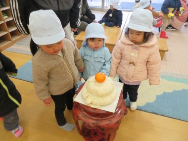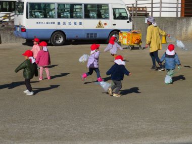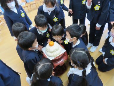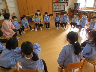 皆で年始の挨拶を交わし、園長先生から「元旦の能登半島地震で、私たちは被害を受けなかったが、他人事と思わず、被害を受けた方々も幸せになれるようにするにはどうしたらよいか考えていきましょう」「今年は閏年で366日ある」「3学期は3ヶ月しかないから、しっかり楽しみましょう」などのお話を聞きました。