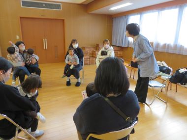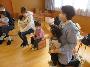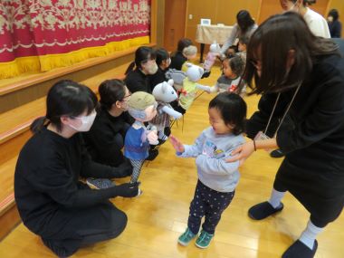 遊戯室には、さくらんぼと同じ年の2歳のお友だち・地域の方・園保護者の方々も観に来て下さり、一緒に観劇しました。