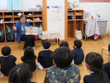 年長さんの保育室に和子先生が来て下さり、絵本の読み聞かせをして下さいました。静かに耳を傾ける年長さん。
