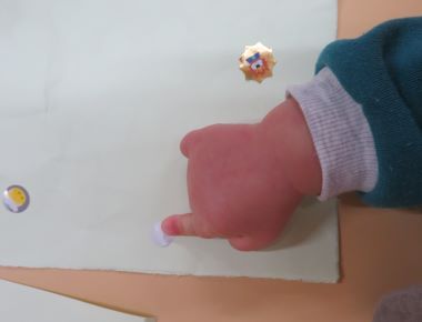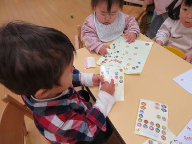 つくしさん(0歳児)のお友だちがシール遊びをしていました。上手く台紙からはげるかな?両手を使って頑張っていました。