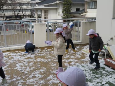 久しぶりの雪です。年長さんはテラスに出て雪玉を作ったり雪合戦をして遊んでいます。