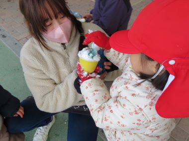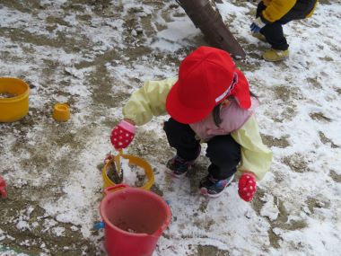 年少さんは上手に雪をすくい取ってカップに入れて色水をかけた、かき氷を作って遊んでいました。