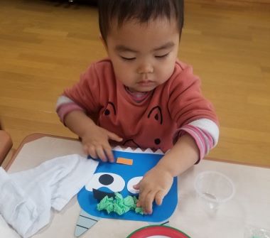 2歳のお友だちがお面とマスを作っています。丸めたり貼ったり指先を使いながら作っていました。