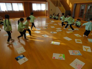 それぞれのクラスで作った、大きなかるたを合わせて2クラス一緒にかるたとり。同じ音で札が2枚あるのでよく考えて、でも早く取ろうと真剣です。