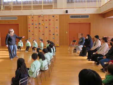 英語参観もありました。ジョージア先生と挨拶をかわしたり、歌をうたったり楽しむ様子を見て頂きました。半数の方には26日にお越しいただきます。