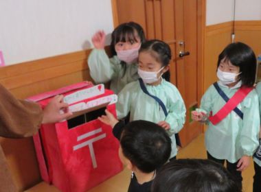 2歳のお友だちのハガキが投函されるのが待ちきれない郵便屋さん。職員室の園長先生に届けてくれました。