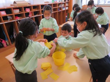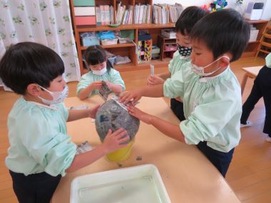 年長さんはグループに分かれて風船に新聞紙やおはな紙を貼っています。張り子のお面を作るそうです。