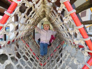 大型遊具のネットのトンネルも出口の先生に向かって「よいしょ、よいしょ」と歩いてきていました。