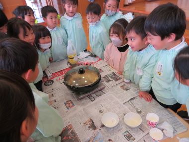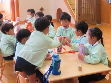 夏に収穫し、取っておいたポップコーンの種で年長合同のポップコーンパーティーを行いました。