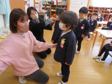 年中・年少・2歳児のお友だちは先生に来年度のクラスの名札を付けてもらって終業式に参加します。