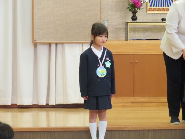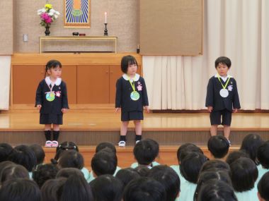 ステージに立って園長先生からペンダントをかけていただき、皆に歌をうたってお祝いしてもらいました。