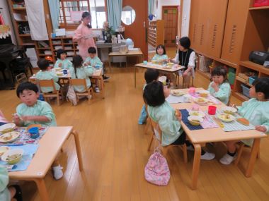 クラスでの誕生会の後はお母さん先生にも配膳をお手伝いいただき、みんなで給食をいただきます。