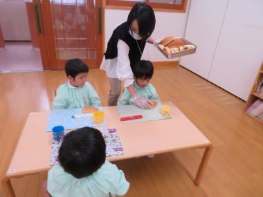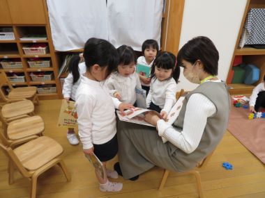 3歳以上のお友だちは遊戯室で誕生会をします。誕生者の保護者の方にもご来園頂き、誕生会に参加したりお子さんの小さい時のお話をして頂いたりし、「おかあさん先生」「おとうさん先生」として保育にご参加いただきます。