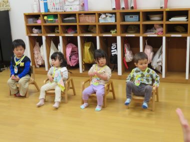 未満児のお友だちはたんぽぽのお部屋に集まりました。会の始めに先生と手遊びをして誕生会の雰囲気を楽しみます。