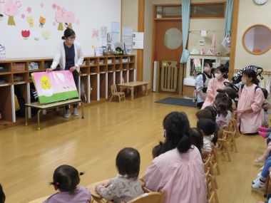 お楽しみのアトラクションは、大型絵本でした。たまごをトントンとすると、たまごの中から色々な動物がでてきましたよ。