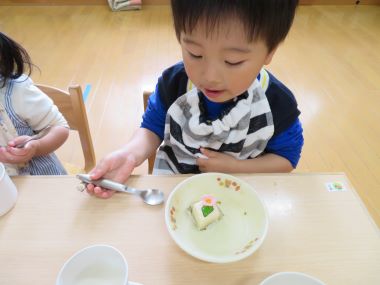 誕生会の日の給食にはデザートにプチケーキが出ます(0.1歳児は果物)。初めてケーキをいただく2歳のお友だちです。