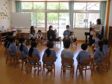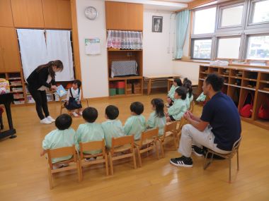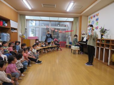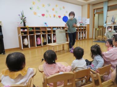 10日に5月の誕生会があり、未満児と3歳以上児、それぞれに集会を行いました。