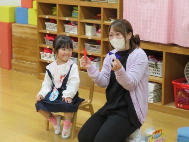 今月の誕生者は、たんぽぽさん1名とすみれさん1名でした。先生からプレゼントをもらいます。