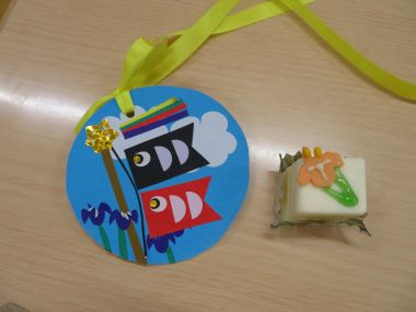 今月のペンダントは、「こいのぼり」。ケーキには菖蒲の花があしらわれていました。(0.1歳児のデザートは果物でした)