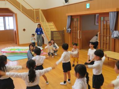 園のこいのぼり運動会は雨で延期になってしまいましたが、朝体操の時間に年長さんが遊戯室やフリースペースに出てきて体操をしてくれました。