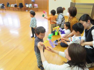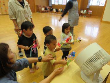 走ったり自分が回ったりしながら風車が回る様子を楽しむこども達でした。