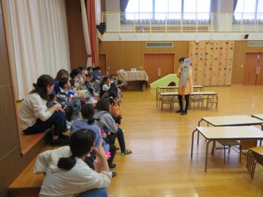 帰りのお集まりの時間です。皆で「ぴょーん」の大型紙芝居を見ました。