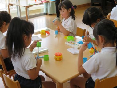年長さんは折り紙を使ってタコを作りました。はさみ・のり・クレヨンを思うように使えるようになってきた年長さんです。