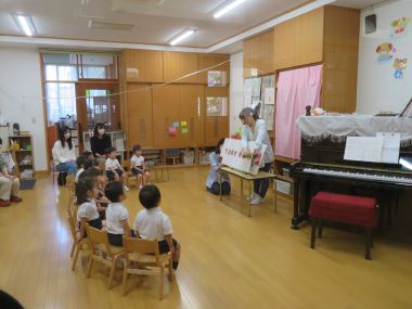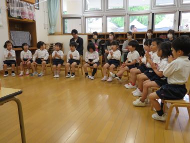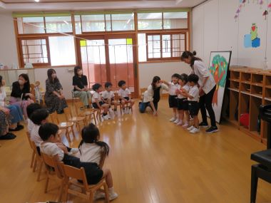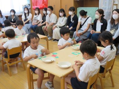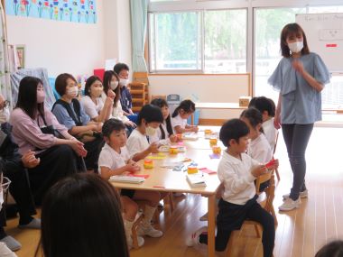 大型絵本を見たり、ミックスジュースを作ったりなど、それぞれのクラスで先生やお友だちと楽しく過ごす姿を見ていただきました。
