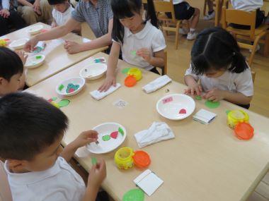 年中さんが切ったり貼ったりしているものは、カエルです。はさみやのりを使って自分のピョンピョンカエルを作っています。