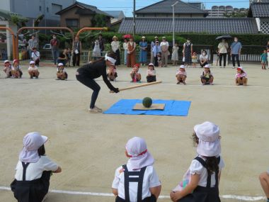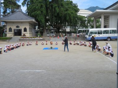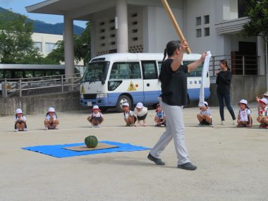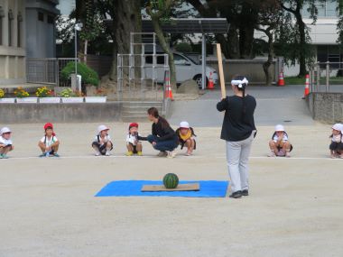 2日目のお楽しみ、スイカ割りです。天気が良く、園庭で行うことができました。