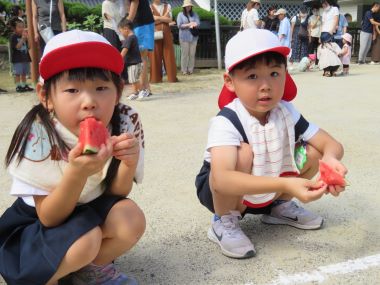 皆でスイカをいただきます。お迎えがてら来園された保護者の方も一緒に頂きました。