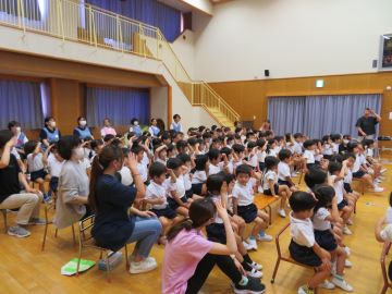 雨の心配がありましたので、実際に道路は歩かずに遊戯室で集会を行いました。