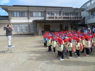 3歳以上児は朝園庭に集まって出発の会を行いました。
