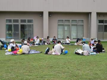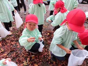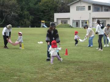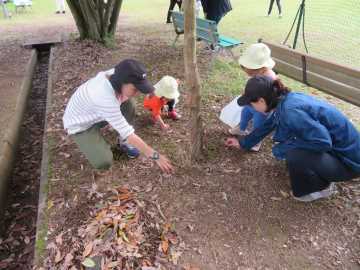 未満のお友だちの食後はお家の方とグランドを自由に散策しました。どんぐりはまだ緑色で落ちていないものが多くありました。