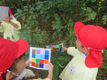 年中さんは折り紙16色を貼った「色探しカード」で色を探したり見比べていました。