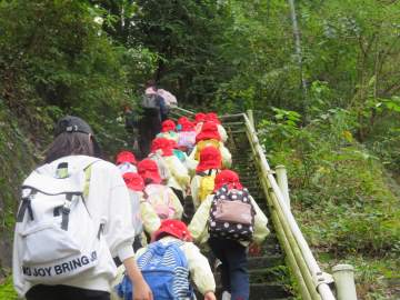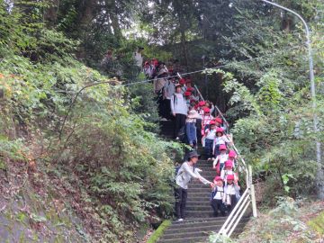 最大の難関、短大への長くて急な階段を上ります。お弁当やどんぐり拾いを楽しみに頑張って登り切りました。