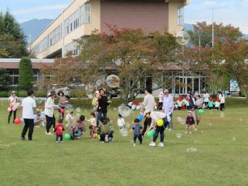 シャボン玉をしたり、ボールで遊んだりとそれぞれの学年ごと広い庭で遊びました。