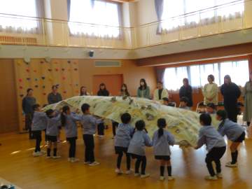皆で周囲を持ってふわっと空気を入れました。丸めた新聞紙をその上に乗せて落とすことも楽しみました。