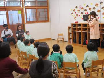 最後は皆で本や紙芝居を楽しみました。この本は運動会で扱ったおばけの題材となった「ばけばけばけばけばけたくん」の絵本です。