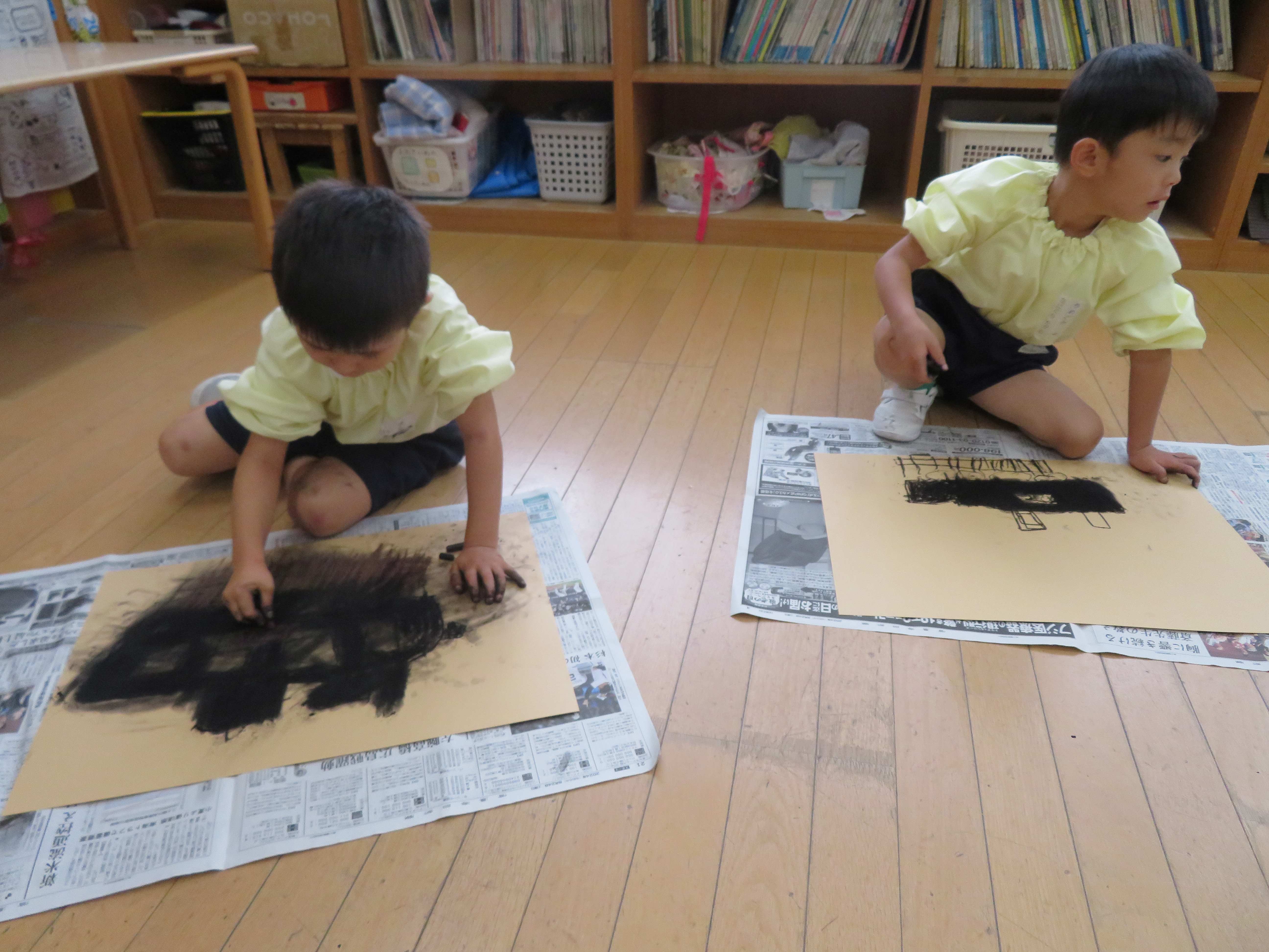園外保育で見てきたD51(デゴイチ)をコンテで描いています。手を真っ黒にしながら大きくて真っ黒なD51を夢中で描いていました。