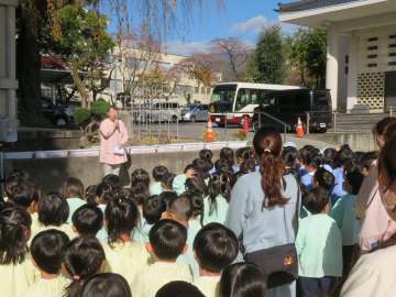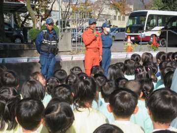 避難してから点呼が終わり、園長先生のお話をお聞きした後、消防士の方に訓練についてお話をいただきました。