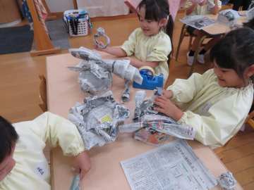 年中さんは新聞紙で自分の帽子を作っています。新聞紙を折ったり握ったりしながら形を作って帽子に飾り付けています。