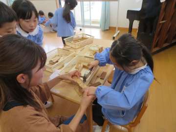 年長さんは積み木や木を使って好きなものを作っています。先生と一緒にくぎを使ってトンカチでトントントン。