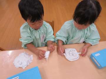 年少さんはねんどで「かお」を作っています。顔には何があるかな?どこにあるのかな?どんな形かな?考えながら作りました。