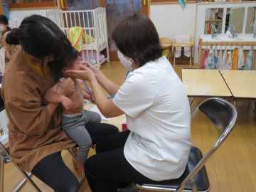 0.1歳のお友だちの内科検診は先生が保育室まで来て下さいました。検診の行われた遊戯室では、2歳のお友だちも写真のように並んで順番を待ったり、先生に挨拶をしたりすることができました。